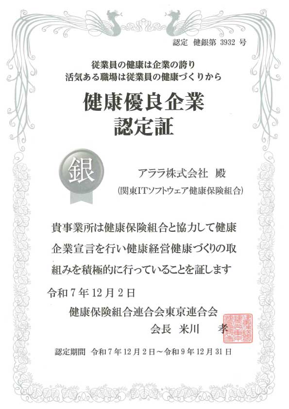 ペイクラウドホールディングス株式会社(東証グロース:4015)の傘下で各種ITソリューション事業を展開するアララ株式会社(本社:東京都港区、代表取締役社長:門倉 紀明)は、健康保険組合連合会東京連合会が認定する健康優良企業「銀の認定」(認定 健銀第3932号)を取得したことをお知らせいたします。